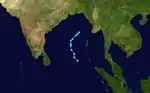 Toward the end of March, an area of convection increased over the southern Bay of Bengal from an active equatorial trough. The system progressed northward,[4] with a weak center between Sri Lanka and Sumatra by March 25.[5] On March 27, a low-pressure area developed, which the IMD designated as a depression by 12:00 UTC. The storm moved to the north-northwest and failed to strengthen at first.[4] However, the JTWC issued a Tropical Cyclone Formation Alert (TCFA) on March 29, a signal of further organization.[5] That day, the IMD upgraded the system to a cyclonic storm,[4] and early on March 30 the storm attained winds of 85 km/h (55 mph) while curving to the north-northeast.[6] Increased wind shear from the westerlies imparted rapid weakening, causing the convection to dwindle to the northeast. According to the IMD, the storm rapidly dissipated on March 30.[4][5]
