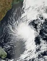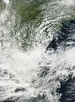 Similar to the previous storm, the active monsoon trough spawned a low-pressure area over the Andaman Sea on October 24. There was a weak center that had good outflow. On October 25, the IMD classified the system as a depression about 925 km (575 mi) southeast of Kolkata. The system moved to the northwest and developed more convection close to the center, although the thunderstorms were intermittent. Turning more to the north, the depression intensified into a deep depression and later cyclonic storm on October 27, reaching peak winds of 65 km/h (40 mph); the JTWC also classified it as Tropical Cyclone 02B. That day, the wind shear increased, although the convection was able to increase over the center and organize into a comma-shaped rainband. Early on October 28, the storm made landfall in southern Bangladesh near Mongla, by which time the wind shear had displaced much of the convection to the northeast. It rapidly weakened over land, degenerating into a remnant low over northern Bangladesh early on October 29.[4][9]