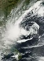 By November 28, a 20 km (12 mi) wide eye was developing, prompting the JTWC to upgrade the storm to the equivalent of a minimal hurricane with winds of 120 km/h (75 mph). By comparison, the IMD estimated peak winds of 190 km/h (120 mph). Wind shear in the region prevented further strengthening, and the storm weakened slightly before making landfall on November 29 in eastern India near Cuddalore. A station there recorded a pressure of 983 mbar (29.0 inHg). The storm rapidly weakened over land, and degenerated into a remnant low on November 30. The remnants emerged into the eastern Arabian Sea on December 1, by which time most thunderstorms had dissipated over the deteriorating center. Two days later, the JTWC reissued advisories, based on an increase in outflow and convective organization. This was short-lived, as the thunderstorms soon dwindled, and the JTWC ceased issuing advisories on December 5. The remnants continued westward without development toward eastern Somalia.[4][9]