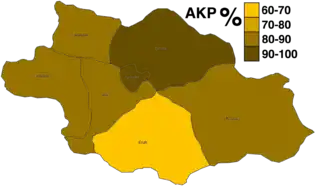 Results obtained by Justice and Development Party (AKP) by district.