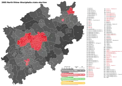 Immediate coverage of the election was overwhelmed by its impact on federal politics: only half an hour after the polls closed, first SPD chairman Franz Müntefering and then Chancellor Gerhard Schröder announced the government's intention to seek an early dissolution of the Bundestag. A federal election had originally not been due until September of 2006, but Schröder and Müntefering felt the need for a renewed mandate for the government's agenda in light of a string of defeats on the state level, of which North Rhine-Westphalia was the most significant as it was a longtime stronghold of the SPD. The result also marked the defeat of the last incumbent SPD-Green state government.[1] This led to a knock-on effect as Schröder quickly brought and deliberately lost a motion of confidence in the Bundestag and subsequently dissolved it. With the election looming, parties were forced to accelerate the selection and announcement of candidates; Angela Merkel was announced as the CDU/CSU's Chancellor candidate just a week after the election in North Rhine-Westphalia.[2] These developments greatly overshadowed the state election and its local consequences, which receded into the background of coverage.
