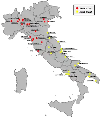 Geographical distribution of 2006-07 Serie C1 teams. Serie C1/A teams are depicted with red dots, whereas Serie C1/B ones were represented with yellow.