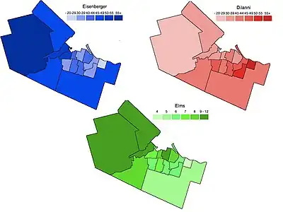 The Ward-By-Ward percentages for the top three candidates: Eisenberger, DiIanni and Elms.