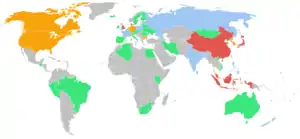 Participating nations. Green: fewer than 5 players; blue: 5–9; orange: 10–14; red: 15 or more.