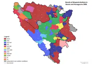Municipal elections were held in Bosnia and Herzegovina on 5 October 2008. Parties and independent candidates had to register by 23 May 2008, party or coalition lists by 25 June 2008. These were the first local elections were representatives of minorities were elected to the municipal assemblies.[1]
