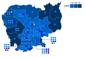 Preliminary results from CPP sources indicated that the CPP had won 58.3% of the vote and 91 seats, whilst the SRP had won 21.9% of the vote and 26 seats, with the Human Rights Party on three seats, the NRP on two and FUNCINPEC with one.[9][10] NGOs and other supervising bodies stated that the distribution was more likely 70 for CPP and 50 for SRP.[11]