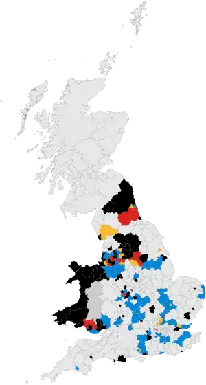 There were also extraordinary elections held for four of the new unitary authorities being created, in Northumberland, County Durham and Cheshire (two councils – Cheshire East and Cheshire West and Chester).[2] Scheduled elections for Penwith in Cornwall, Shrewsbury and Atcham in Shropshire, Bedford and South Bedfordshire in Bedfordshire and five district councils in Cheshire were cancelled, due to the up-coming unitary authorities being established in those counties.