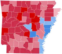 Arkansas was won by Republican John McCain by a 19.86% margin of victory, an even greater margin than George W. Bush attained in 2004, despite the national Democratic trend. This was likely due to the issue of race in the presidential election.[1] Prior to the election, all 17 news organizations considered this a state McCain would win, or otherwise a red state. The state trended dramatically Republican in 2008, as McCain received over 4% more of the statewide popular vote than Bush earned in 2004 and more than doubled his margin of victory. Only five counties swung more Democratic in 2008, and the vast majority of counties swung heavily Republican, some by as much as 30%.[2] Of the ten counties with the largest percentage swing to the Republicans in the U.S. during this election, six of them were located in Arkansas.[3]
