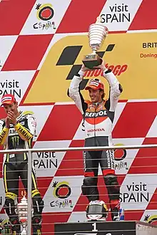 All the riders make their way onto the podium, Dovizioso and de Puniet having a quick chat before the Frenchman steps on the podium, followed by Edwards and Dovizioso. All the riders shake hands and Simon Gillett, then CEO of Donington Park Leisure ltd, hands out the third place trophy to de Puniet, who lifts it up in glee. Next up is Jorge Viegas, a representative of FIM to hand out the second place trophy to Edwards. The crowd cheers loudly as his name is mentioned and he receives the trophy, cheekily sticking out his tongue as he raises the trophy to signify the victory. Then it's the turn of Jean Mesquida, Spanish Minister for Tourism, to hand out the winners trophy to a delighted Dovizioso, lifting the big trophy up his head as he smiles. The Italian national anthem plays for Dovizioso and as it stops, the podium girls hand out the champagne. De Puniet immediately sprays the crowd upon receiving it, followed by Edwards and then Dovizioso before they spray each other. They then toast their champagne bottles before drinking some out of it. The riders climb upon the podium and pose for the group photo.