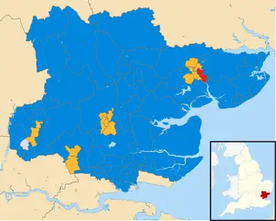 Results by electoral division.Conservatives in blue, Liberal Democrats in yellow, Labour in red and in grey the Canvey Island Independent Party and Independent Loughton Residents Association.