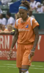 Sky Blue FC were held without a goal in their next two games, which resulted in one loss and one draw. Those results left the team with a 6–7–5 record; they were undefeated when playing Boston and Chicago, but winless against the other four WPS clubs.[29] On July 29, Lindsey resigned as head coach of the team, along with assistant coach Joe Dorini.[29] The club named Rampone as their third head coach of the year; she served as a caretaker player-coach for the rest of the season.[30] On August 5, Rampone's side defeated FC Gold Pride 2–0 behind second-half goals by Rosana and Kai; the win left Sky Blue FC in position to qualify for the WPS playoffs, which the top four teams would contest, with one match remaining in the regular season. With 26 points, they were level with third-place Washington, their opponents in the finale, and one point ahead of fifth-place Boston.[31] Although Sky Blue FC were defeated 3–1 by the Freedom, the Breakers lost to Los Angeles in their final game, giving Sky Blue FC the fourth and final postseason berth.[30] They ended up with seven wins, eight losses, and five draws in the regular season.[32]