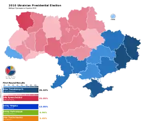 Early-vote returns from the first round of the election held on 17 January showed Yanukovych in first place with 35.8% of the vote.[7] He faced a 7 February 2010 runoff against Tymoshenko, who finished second (with 24.7% of the vote).