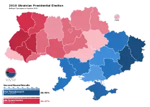 Analysts predicted that both candidates had a chance to win the second round.[8] Yanukovych refused to hold debates with his opponent before the second round of voting, saying Tymoshenko should either take responsibility for every word as prime minister, or go to the kitchen.[9] After all ballots were counted, the Ukrainian Central Election Commission declared that Yanukovych won the election with 48.95% of the vote compared with 45.47% for Tymoshenko.[10] Yulia Tymoshenko Bloc members immediately claimed that there was systematic and large-scale vote rigging in this run-off.[11][12][13][14]