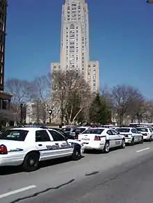 Police cars along Forbes Avenue near the Cathedral of Learning during the funeral ceremony