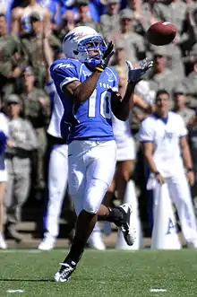 Falcons wide receiver Mikel Hunter pulls in a pass for a touchdown during the Air Force–BYU game.