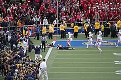 Washington got on the board on its first possession of the second half when Locker connected with wide receiver D'Andre Goodwin for an 80-yard touchdown. Cal's sole touchdown of the game came on defense, when Locker was sacked in Washington territory by linebacker Mike Mohammed and fumbled, enabling defensive lineman Cameron Jordan to recover the fumble for a 21-yard touchdown. The Huskies were able to come back and tie the game on a 37-yard field goal in the closing seconds of the quarter. The Bears regained the lead with a 47-yard field goal to open the fourth quarter. In the final minutes of the game, Locker was able to complete a 46-yard pass to Jamaal Kearse, enabling the Huskies to drive down to the 1-yard line. After two straight rushes by Locker failed, running back Chris Polk was able to score the game-winning touchdown with 2 seconds left in the game.[60]