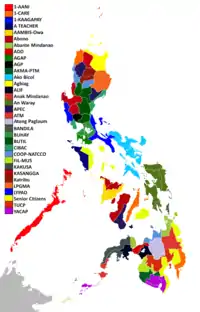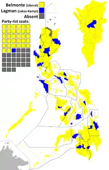 District election results (80% of the seats), with Metro Manila on the inset, and party-list seats indicated by black boxes.