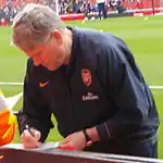 Arsenal's pre-season transfers started as early as 30 April 2012, when Arsenal announced they were going to sign German international Lukas Podolski from 1. FC Köln for an undisclosed fee,[4] thought to be around £10.9 million.[5] Podolski officially joined Arsenal when the summer transfer window opened on 1 July.[6] Podolski became the second German player to join the club in the space of a year, following the arrival of Per Mertesacker from Werder Bremen last summer, whom Podolski himself stated, played a big part in the transfer after talking about life at the Emirates.[7] As well as early transfer news, Arsenal had early staff news, whereby, after 48 years of being associated with Arsenal, assistant manager Pat Rice retired at the end of the previous season. He was replaced on the same day by academy team manager, Steve Bould.[8] Pat Rice played a big role at Arsenal, and was highly praised following his retirement by both the players and by manager Arsène Wenger.[9]