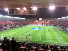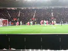 Southampton began their first top-flight campaign in seven years against reigning champions Manchester City and runners-up Manchester United, and picked up only four points from their opening ten games leaving them firmly at the bottom of the table.[26][27] In November and December the team's fortunes improved, and they picked up important wins over fellow strugglers to lift themselves out of the relegation zone.[28][29] After Christmas the Saints went on a six-game unbeaten run, and they later picked up high-profile wins against Manchester City, Liverpool and Chelsea to continue to move away from the drop zone. Survival in the Premier League was confirmed on 14 May when Wigan Athletic lost to Arsenal to take the final relegation place.[30] Southampton finished 14th in the table having won nine, drawn 14, and lost 15 of their 38 games, collecting 41 points in the process.[31]