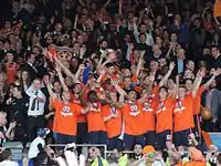 Luton missed their opportunity to confirm promotion on their own terms, losing 3–2 at home to Braintree Town on 12 April in an incident-filled game played front of the biggest number of Luton fans at Kenilworth Road in over 20 years.[125] However, on 15 April, a 2–0 defeat for nearest rivals Cambridge United to Kidderminster Harriers meant that Luton were mathematically confirmed as Conference Premier champions with three league games left to play, and would contest the next season in League Two.[126]