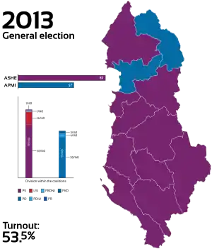 Parliamentary elections were held in Albania on 23 June 2013.[1] The result was a victory for the Alliance for a European Albania led by the Socialist Party and its leader, Edi Rama.[2] Incumbent Prime Minister Sali Berisha of the Democratic Party-led Alliance for Employment, Prosperity and Integration conceded defeat on 26 June,[3] widely viewed as a sign of growing democratic maturity in Albania.[4]