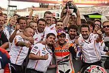 Marc Márquez, celebrating with the team at parc fermé after finishing first at the MotoGP race.