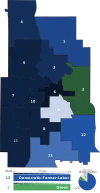 The 2013 Minneapolis City Council elections were held on November 5, 2013 to elect the 13 members of the Minneapolis City Council for four-year terms. 10 races produced a winner in the first round and the remaining three in the second round. Candidates affiliated with the Minnesota Democratic–Farmer–Labor Party (DFL) won all 12 of the seats where they had fielded a candidate, and the Green Party of Minnesota won the remaining one seat.