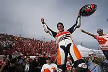 After two more victories for Lorenzo at Silverstone,[15] and Misano,[16] Márquez and Pedrosa collided at the Aragon Grand Prix, where a slight touch caused a sensor on Pedrosa's bike to tear and cut the traction control system.[17] Márquez went on to beat Lorenzo to victory,[18] and after Pedrosa won in Malaysia,[19] Márquez held a 43-point lead in the championship with three races to go.[20] However, a disqualification in Australia,[21] as well as Lorenzo winning both in Australia and Japan reduced that margin to thirteen,[22] ahead of the final race in Valencia; the first final race title decider since 2006.[22] After battling Pedrosa and Lorenzo in the early stages of the race, Márquez finished third in the race to become the youngest premier class champion, beating Freddie Spencer's record from 1983.[4] As well as this, Márquez became the first rookie since Kenny Roberts in 1978 to win the championship in their début season,[4] and only the fourth rider to win world championships in three different categories after Mike Hailwood, Phil Read and Rossi.[4] Pedrosa's second place, behind Lorenzo,[23] was enough for Honda to clinch the constructors' championship.