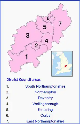 ![]() Map showing the results of the 2013 Northamptonshire County Council elections. | |||||||||||||||||||||||||||||||||||||||||