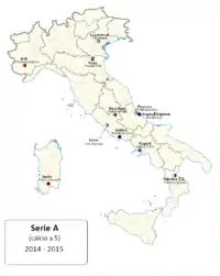 The 2014–15 season of the Serie A is the 30th season of top-tier futsal in Italy, which began September 27, 2014 and will finish on April 18, 2015. At the end of the regular season the top eight teams will play in the championship playoffs. The quarter and semi-finals will be a best of three series and the final will be a best of five-game series. The bottom two clubs will play in a two-leg playoff (home and away) to see who is relegated to Serie A2.