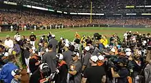 members of the 2014 Baltimore Orioles celebrating at Oriole Park immediately after clinching the American League East title
