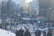 - ↑ Anastasia Vlasova (24 January 2014). "EuroMaidan protesters build new barricades on Hrushevskoho Street". Kyiv Post. Archived from the original on 25 January 2014. Retrieved 24 January 2014.
