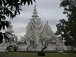 ![]() The damaged Wat Rong Khun, a major attraction in Mueang, Chiang Rai; The broken spire could be observed | |