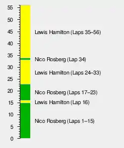 Massa kept reasonably between both Mercedes cars and was 2.4 seconds ahead of Ricciardo. Williams elected to make a pit stop for the medium compound tyres for Bottas at the end of lap 30 and Ricciardo responded by going seven-tenths of a second faster than Bottas in the final third of the lap.[40] Ricciardo made his pit stop on the following lap and emerged ahead of Bottas. He began matching Massa's pace before the latter made a problematic pit stop on lap 32:[41] his mechanics were delayed for one second in the installation of a front tyres,[40] promoting Ricciardo to third.[43] Hamilton entered the pit lane from the lead on the 33rd for his final stop and rejoined in second, behind teammate Rosberg, whom Mercedes told to go faster. Rosberg led lap 34 before making his pit stop, returning the lead to Hamilton.[42] Vettel overtook Grosjean for tenth on lap 37 and drew close to Magnussen soon after.[41] He overtook Magnussen on the outside three laps later but was unable to slow sufficiently and the latter retook ninth.[42]