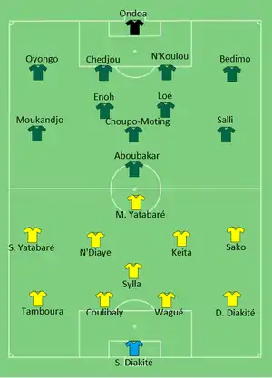 Mali took the lead in the 71st minute as Molla Wagué's flick-on from a free kick allowed Sambou Yatabaré to score at the far post. Cameroon equalized in the 84th minute, after Ambroise Oyongo controlled Raoul Loé's lofted pass to score from close range.[8][9]