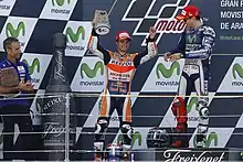 Dani Pedrosa and Jorge Lorenzo, celebrating on the podium after finishing second and first at the MotoGP race.