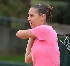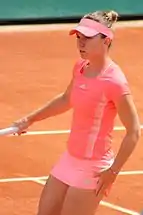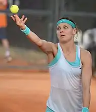 Simona Halep began the year by winning the Shenzhen Open over Timea Bacsinszky.[14] She then reached the quarterfinals of the Australian Open but lost to Ekaterina Makarova in straight sets.[15] She won her second title of the year at the Dubai Tennis Championships defeating Karolína Plíšková in the final.[16] She won the biggest title of her career at the BNP Paribas Open defeating Jelena Janković in the final.[17] However, Halep suffered a dip in form losing to Mirjana Lučić-Baroni in the second round of the French Open and a first-round loss at Wimbledon to Jana Čepelová. Halep rebounded at the US Open Series by reaching back-to-back finals at Toronto and Cincinnati, retiring against Belinda Bencic and losing to Serena Williams, respectively.[11][18] Halep reached the semifinals of the US Open but was upset by eventual champion Flavia Pennetta. This is the second time Halep has qualified for the Year-End Championships.