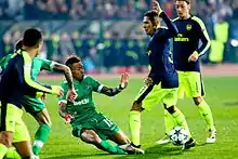 Arsenal started November with a Champions League game away to Ludogorets Razgrad. Despite the Bulgarian side going into a shock 2–0 lead early on, Arsenal eventually came back with goals through Granit Xhaka, Olivier Giroud and a late Mesut Özil goal to win 3–2 and qualify for the knockout stages. This took Arsenal's unbeaten run to 15 games in all competitions.[40][41] Arsenal then participated in the North London derby, hosting Tottenham Hotspur in Premier League action on 6 November. Arsenal gained the lead just prior to the half-time break, with Kevin Wimmer glancing Özil's free-kick past Hugo Lloris, before Spurs responded with a Harry Kane spot-kick following a tangle between Laurent Koscielny and Mousa Dembélé. Despite presses from either side late on, the game ended 1–1, and left Arsenal fourth in the Premier League going into the international break.[42] Arsenal returned to Premier League action against Manchester United at Old Trafford on 19 November. During the match, Arsenal had not had an effort on goal and often conceded to allow United to control the game for long periods, and their advances toward goal were rewarded through a Juan Mata left-foot finish after 68 minutes. During the dying moments of the game, however, a substitute Giroud rose at the far post to head home an Alex Oxlade-Chamberlain cross.[43]