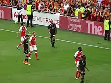 On 14 January Arsenal went to South Wales for the next Premier League match and won 4–0 at Swansea. Olivier Giroud scored his fifth goal in five matches, followed by own goals by Jack Cork and Kyle Naughton, before the fourth goal was fired home by Alexis Sánchez.[56] Eight days later Arsenal faced Burnley at the Emirates. Following a goalless first half, Shkodran Mustafi scored his first Arsenal goal, heading home from a corner on 59 minutes. Granit Xhaka was then unusually sent off by referee Jonathan Moss and in stoppage time it got much more dramatic: in the 93rd minute Burnley were awarded a penalty through which Andre Gray scored. A cruel hammer blow for Arsenal meant that it was destined for the visitors to bring back a point but then in the 97th minute the Gunners themselves were handed a penalty despite an offside appeal. Sánchez scored from the spot in the final minute of stoppage time to keep the three points in North London. The match moreover saw Arsène Wenger get sent off for complaining to the fourth official about the Burnley penalty decision. For this offense Wenger was given a domestic four match ban which made him sit on the 'naughty step' and watch assistant manager Steve Bould do the touchline duties for the next four matches.[57] On 28 January, Arsenal played in the FA Cup fourth round at Southampton. A brace by Danny Welbeck and a hat trick by Theo Walcott made them cruise into the fifth round with a comfortable 5-0 win.[58] Two days later Arsenal continued the Premier League campaign but they suffered a shock 2–1 home defeat by Watford. Former Tottenham defender Younès Kaboul gave the visitors the lead through a deflected strike from outside the box early in the first half and three minutes later Troy Deeney doubled Watford's advantage. In the second half Arsenal were back into it as Alex Iwobi gave the Gunners hope. Arsenal piled on the pressure for the remaining minutes and Lucas Pérez hit the bar but they were unable to get the equaliser. The match ended 2–1 to Watford as the month of January ended harshly for the Gunners.[59]