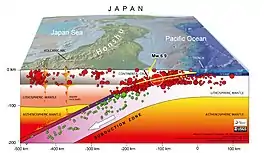 The schematic block diagram shows the location of today’s Mw 7.4 earthquake. The earthquake occurred within the overriding plate above the subduction zone interface that ruptured during the 2011 Tohoku-Oki earthquake.[10]