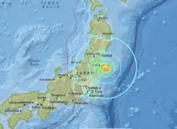 The earthquake measured magnitude 7.4. It struck off mainland Japan 35 km (22 mi) east-southeast of Namie, Fukushima Prefecture at 05:59 JST on November 22, 2016 (20:59 Nov 21 UTC), at a depth of 9.0 km ± 1.7.[3][4] The earthquake was initially reported as having a magnitude of 7.3 by the Japan Meteorological Agency, who later upgraded the magnitude to 7.4, while the United States Geological Survey and GFZ Potsdam reported it as having a magnitude of 6.9 Mwb.[5]