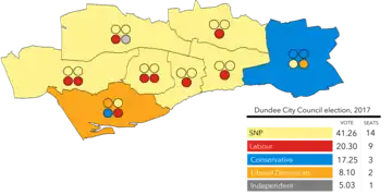Elections to Dundee City Council were held on 4 May 2017 on the same day as the other Scottish local government elections. The election used the eight wards created as a result of the Local Governance (Scotland) Act 2004, with each ward electing three or four Councillors using the single transferable vote system (a form of proportional representation). A total of 29 Councillors were elected.