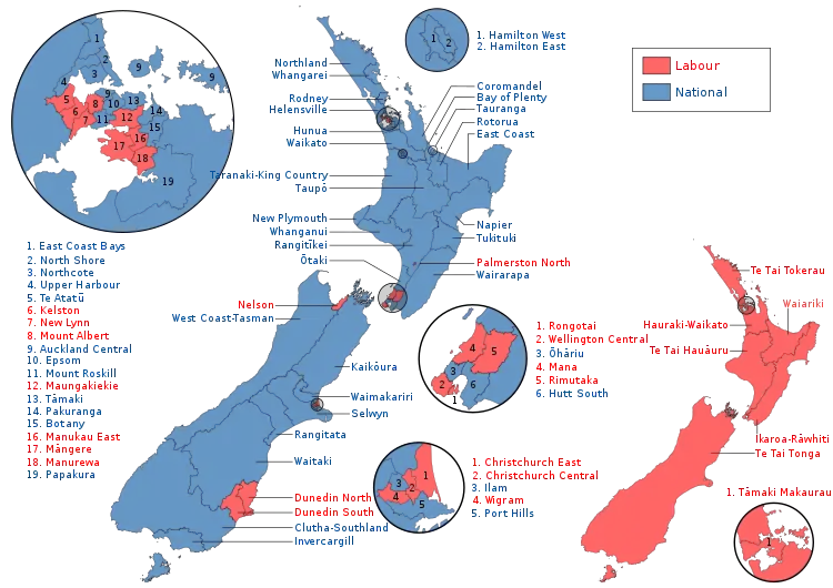 ![]() Map of the general election. Electorate results are shown on the left, Maori electorate results in the centre, and the list members on the right. | |||||||||||||||||||||||||||||||||||||||||||||||||||||||||||||||||||||||||||||||||||||||||||||