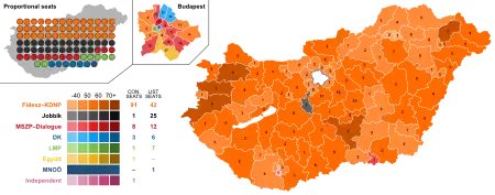 At the previous parliamentary election, in April 2014, the incumbent government—composed of Fidesz and its satellite ally the Christian Democratic People's Party (KDNP)—was able to achieve a two-thirds majority for the second consecutive time with 44.87 percent of the votes. According to their critics, this overwhelming proportion was only because of the new election law (mostly due to the introduction of compensation votes also for the individual winners) which was adopted by the ruling coalition in 2011.[4] In early 2015, however, Fidesz lost its two-thirds majority following the 2014 Hungarian Internet tax protests and subsequent decrease in support for the government.[5] The governing party suffered defeats at two parliamentary by-elections in February and April 2015, both in Veszprém County.[6][7]