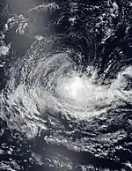 However, Bongoyo's intensification trend was halted as the impacts of strengthening vertical wind shear caused the eyewall to become eroded later into the day.[22] Bongoyo maintained its strength, although the overall structure of the storm became increasingly vertically tilted.[23] On 18:00 UTC on 9 December, Bongoyo finally weakened back down to a moderate tropical storm after maintaining its strength for over a day while convection became sheared away from the circulation.[24] Bongoyo soon began its westward turn on 10 December as it began to ride along the southern edge of a subtropical ridge, and it became a remnant low early on 11 December as all convection sheared away from the low level circulation, thus the last advisory was issued by both MFR and the JTWC.[25][26]