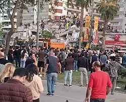Overall, minor damage occurred on Samos despite its close proximity to the epicentre. Most of the damage and casualties were from the Bornova and Bayraklı districts of İzmir; located at least 70 km (43 mi) north of the epicentre.[73] On 4 November, the mayor of İzmir, Tunç Soyer, stated that 15,000 people in the city were made homeless.[74] Total damage is estimated to be in the millions for Greece, and over $400 million for Turkey.[75] Serious structural damage and pancake-style building collapses caused many deaths in Izmir.