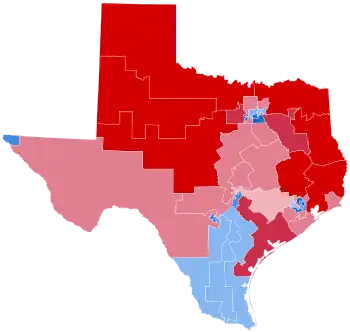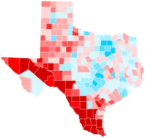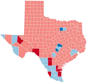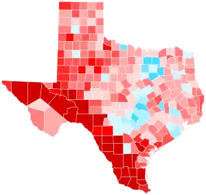 Although it was considered a vulnerable state for Trump by some pollsters and experts and a potential upset victory for Biden due to its recent demographic trends, Trump held Texas with 52.1% of the vote, roughly the same percentage he carried it with in 2016. Biden improved on Hillary Clinton's 2016 vote share by 3.24%, giving him the largest percentage in the state by a Democratic presidential candidate since Jimmy Carter carried the state in 1976. Trump's 5.58% margin of victory was also the narrowest for a Republican since 1996. Texas was the third-narrowest of Trump's state victories, behind only Florida and North Carolina, and the ninth-closest state overall. The election was also the first time Texas placed in the top ten closest states since 1968, and the first time since 1976 that Texas voted to the left of Ohio.[5][6] This was also the first election since 1964 that the counties containing the five largest cities in Texas, consisting of Houston, San Antonio, Dallas, Austin, and Fort Worth, would vote Democratic at the same time. As in most other states in 2020, Trump significantly outperformed his polling.[7] Voter turnout in the state increased to its highest level since 1992, when two Texans, George H. W. Bush and Ross Perot, were on the ballot, and the last time Texas was a battleground state.[8]
