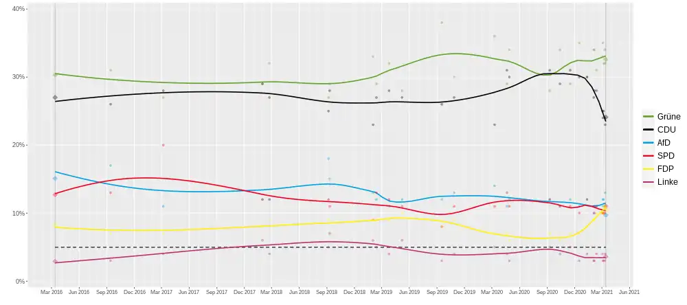 In the previous election held on 13 March 2016, The Greens became the largest party for the first time in any German state, winning 30.3% of votes cast. The CDU lost 12 percentage points, falling to second place on 27.0%. Alternative for Germany contested their first state election in Baden-Württemberg, placing third with 15.1%. The Social Democratic Party (SPD) lost almost half its voteshare and finished with 12.7%. The Free Democratic Party (FDP) won 8.3%.