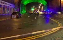 About 20 minutes following the attack at University Hospital Crosshouse, a second incident occurred in the town centre by the railway viaduct. At 8:05 pm, a 24-year-old woman was stabbed and seriously wounded.[5] She was taken to hospital where she later died from her wounds.[5] Portland Street, where the viaduct is situated, was cornered off by police attending the scene, with all traffic being diverted away from the area.[9] The public were strongly urged to stay away from the area.[10][11]