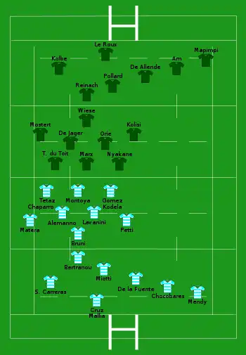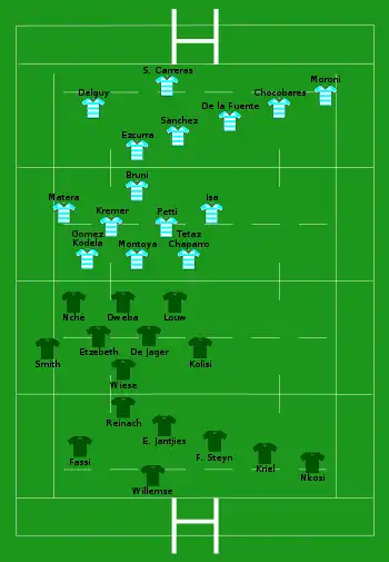 | Try: Reinach 14' c Fassi 18' m Hendrikse 78' m Con: E. Jantjies (1/2) 15' Pen: E. Jantjies (5/5) 2', 23', 37', 47', 58' | Report | Pen: Sánchez (4/4) 17', 35', 40', 43' |